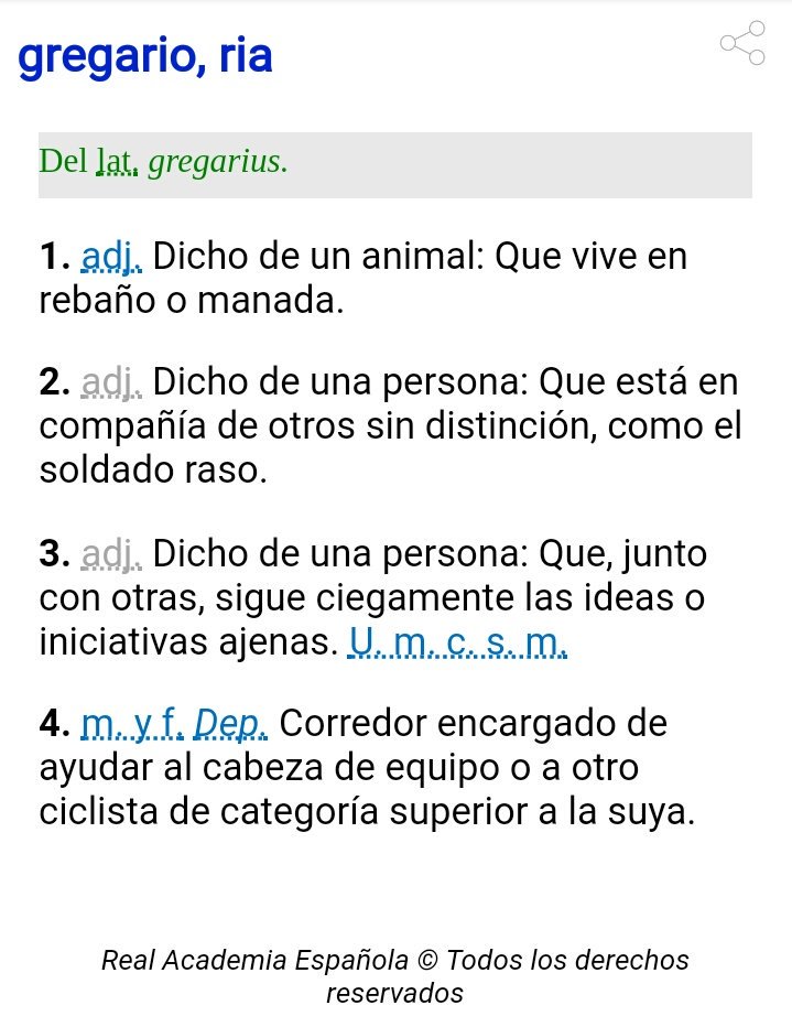 Gregario - significado de gregario diccionario adj. Que está en compañía sin distinción. fig.Que sigue servilmente las ideas o iniciativas ajenas. Díc. del ser vivo que tiene tendencia a asociarse con otros individuos de la misma especie. Diccionario Enciclopédico Vox 1. © 2009 Larousse Editorial, S.L. gregario, -ria ( gɾe'γaɾjo, -ɾja) abreviación