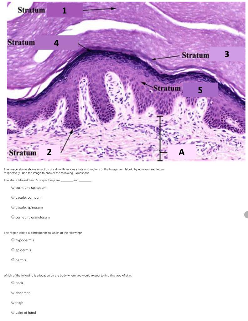 Solved Stratum Stratum Stratum 3 Stratum 5 Stratum 2 А The ... Stratum Stratum Stratum 3 Stratum 5 Stratum 2 А The image above shows a section of skin with various strate and regions of the integument labeld by numbers and letters respectively. Use the image to answer the following 3 questions. The strata labeled 1 and 5 respectively are and corneum, spinosum basale: corneum basale; spinosum O corneum ...