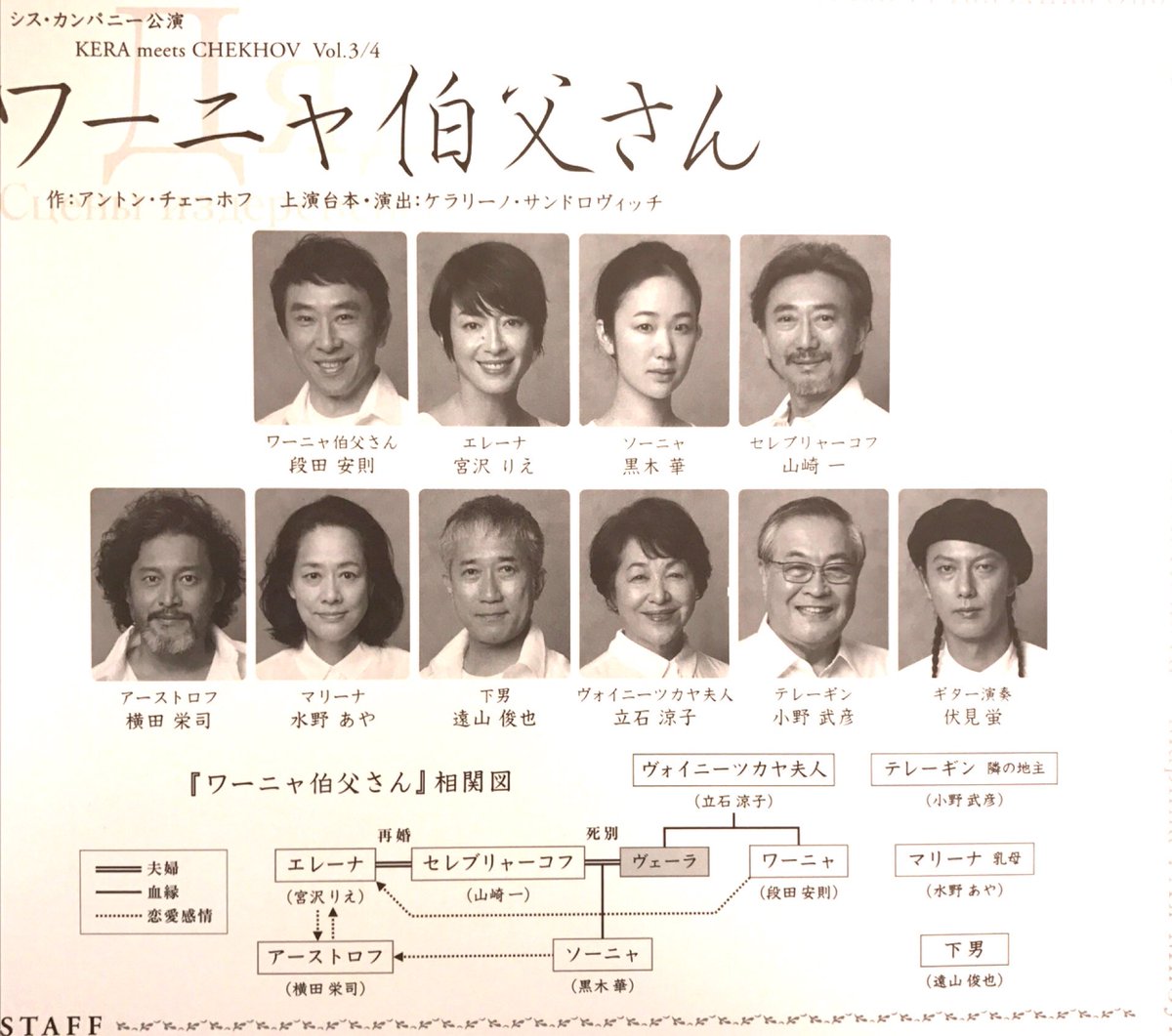 ワーニャ 伯父 さん. ワーニャ伯父さんとは - コトバンク ワーニャ伯父さんワーニャおじさん. Dyadya Vanya ... ロシアの作家 A.チェーホフの戯曲。チェーホフ四大戯曲の一つで,1889年の戯曲『森の精』を原型に,『かもめ』に次いで ... KERA演出『ワーニャ伯父さん』が開幕~KERA・段田安則・宮沢りえ・黒... Aug 28, 2017 · 公演情報. 『ワーニャ伯父さん』. 日時:2017年8月27日 (日)~9月26日 (火) 会場:新国立劇場 小劇場 (東京都) 作:アントン・チェーホフ. 上演台本・演出:ケラリーノ・サンドロヴィッチ. 出演:段田安則/宮沢りえ/黒木華/山崎一/横田栄司/水野あや ... ワーニャ伯父さん/三人姉妹 (光文社古典新訳文庫) - アマゾン Amazonでアントン・パーヴロヴィチ チェーホフ, 雅春, 浦のワーニャ伯父さん/三人姉妹 (光文社古典新訳文庫)。アマゾンならポイント還元本が多数。 アントン・チェーホフ『ワーニャ伯父さん』の登場人物、あらすじ、感... アントン・チェーホフ作『ワーニャ伯父さん』は、一八九七年に発表され、一八九九年にモスクワ芸術座で初演されました。『桜の園』、『かもめ』、『三人姉妹』と並び、チェーホフの四大戯曲と呼ばれる作品のうちのひとつです。 退職した大学教授セレブリ