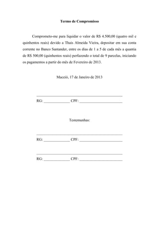Termo de compromisso - SlideShare termo de compromisso comprometo-me para liquidar o valor de r$ 4.500,00 (quatro mil e quinhentos reais) devido a thais almeida vieira, depositar em sua conta corrente no banco santander, entre os dias de 1 a 5 de cada mês a quantia de r$ 500,00 (quinhentos reais) perfazendo o total de 9 parcelas, iniciando os pagamentos a partir do mês de …