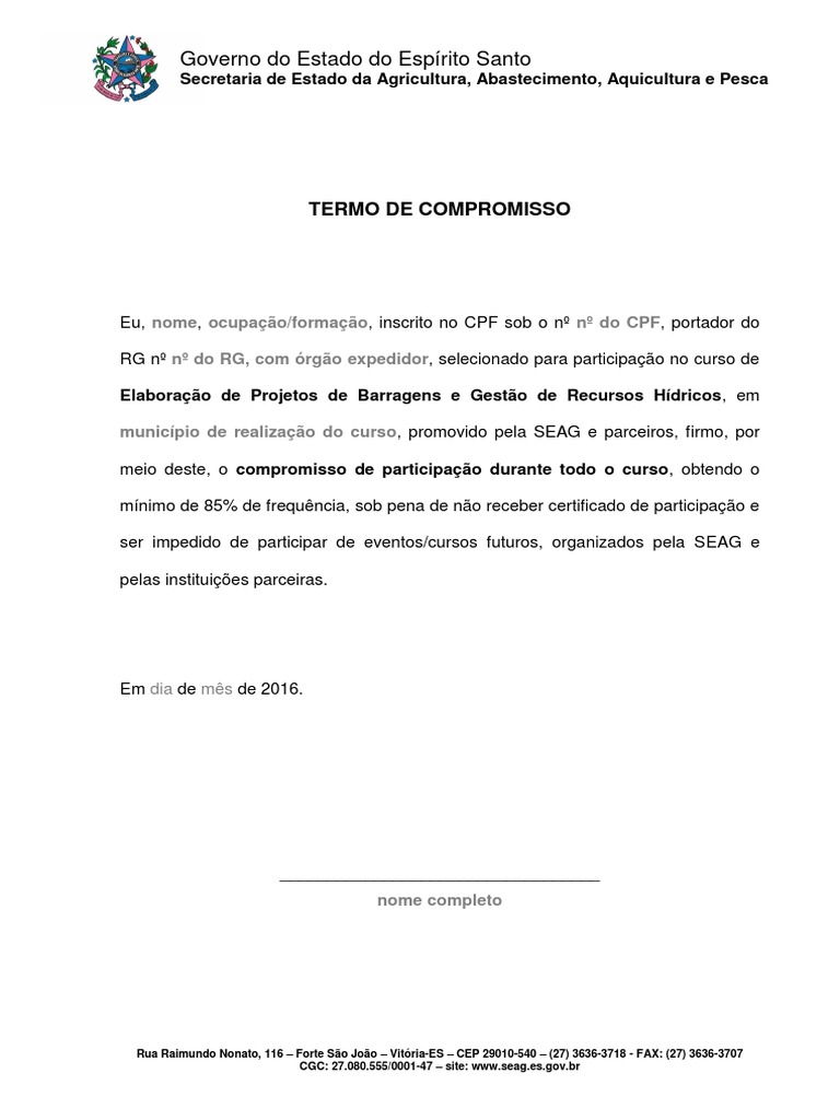 Modelo de contrato ou termo de compromisso | Código Civil ... Gostaria de receber um modelo de termo de compromisso firmado entre a sociedade católica e a associação de moradores. Resposta do Portal Cursos CPT 4 de abr. de 2017. Olá Dirceu, Agradecemos sua visita e comentário em nosso site. Para mais informações recomendamos que procure em mecanismos de pesquisa como o Google.