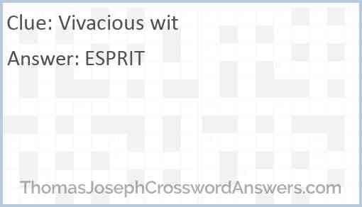 Vivacious Wit Crossword Clue, Puzzle and Solver - Crossword Leak The Crosswordleak.com system found 12 answers for vivacious wit crossword clue. Our system collect crossword clues from most populer crossword, cryptic puzzle, quick/small crossword that found in Daily Mail, Daily Telegraph, Daily Express, Daily Mirror, Herald-Sun, The Courier-Mail and others popular newspaper.